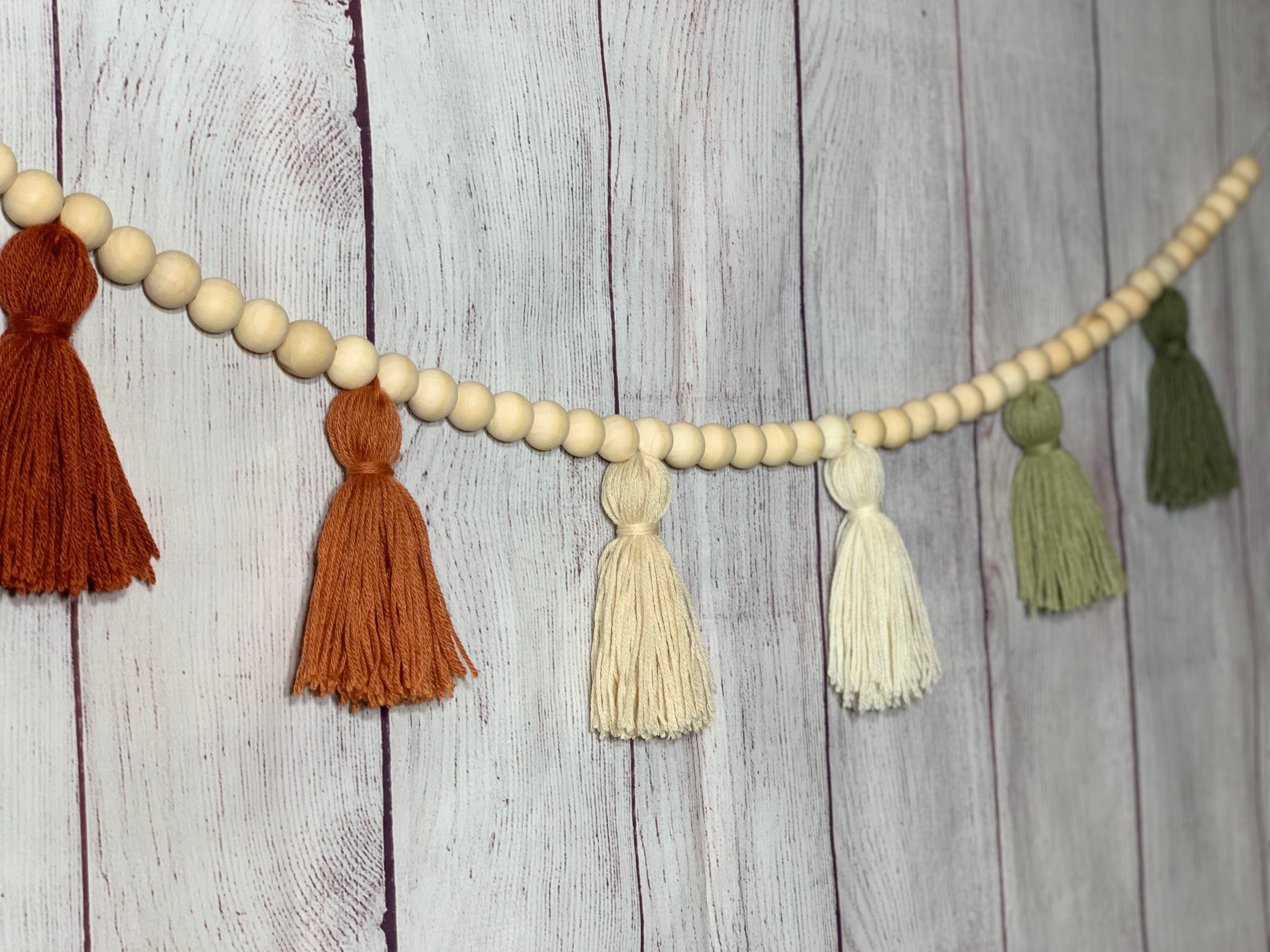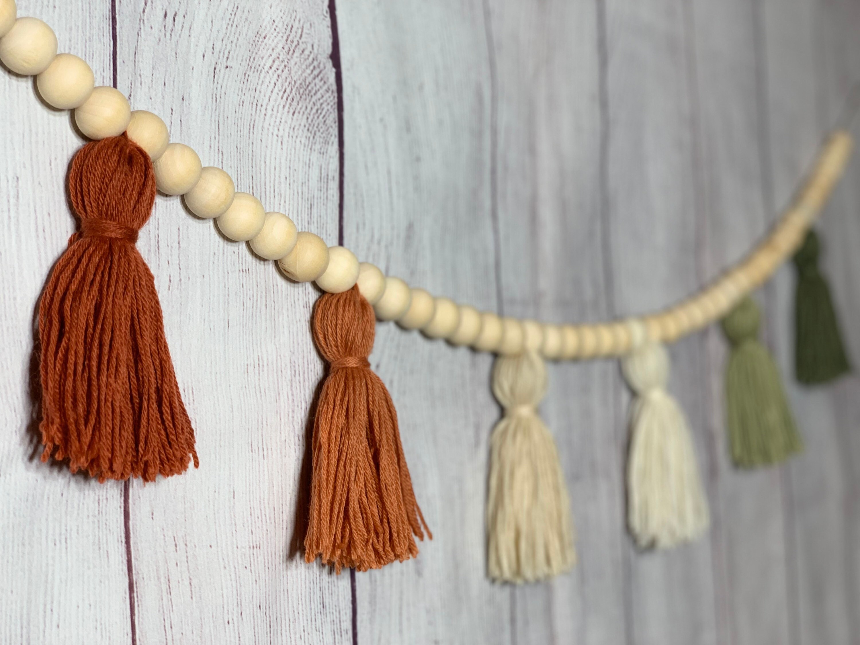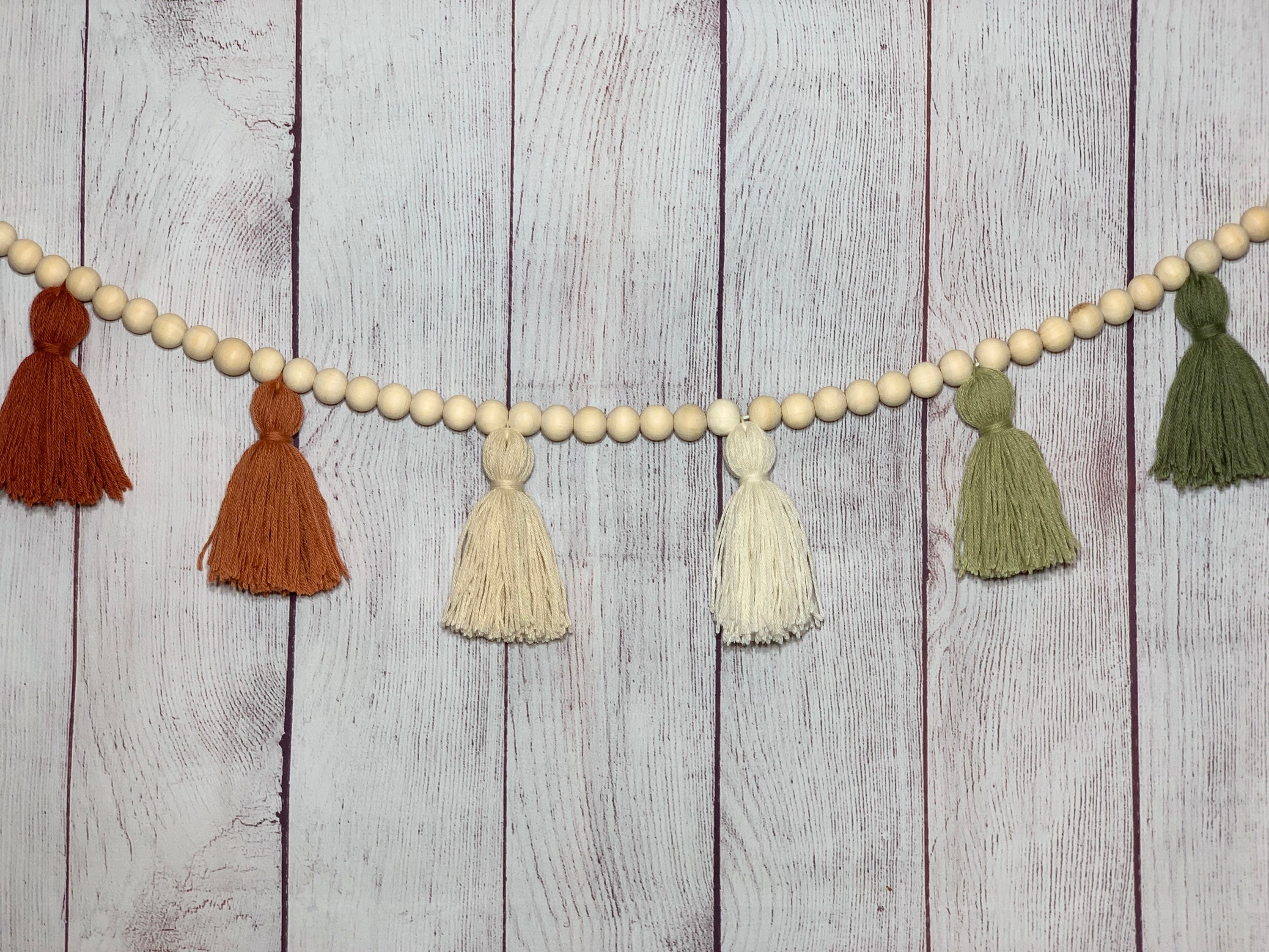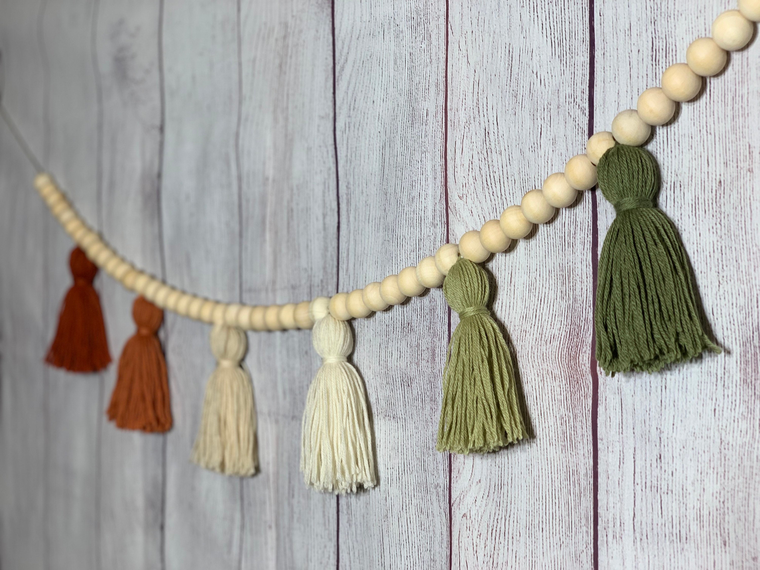 Hello, Fall! Let the decorating for the new season begin. This beautiful fall banner includes 6 different autumn shade colors separated by 7 wooden beads. The whole string measures about 5 ft, and from first bead to last bead measures just short of 3 ft. It’s the perfect addition to add to any room.