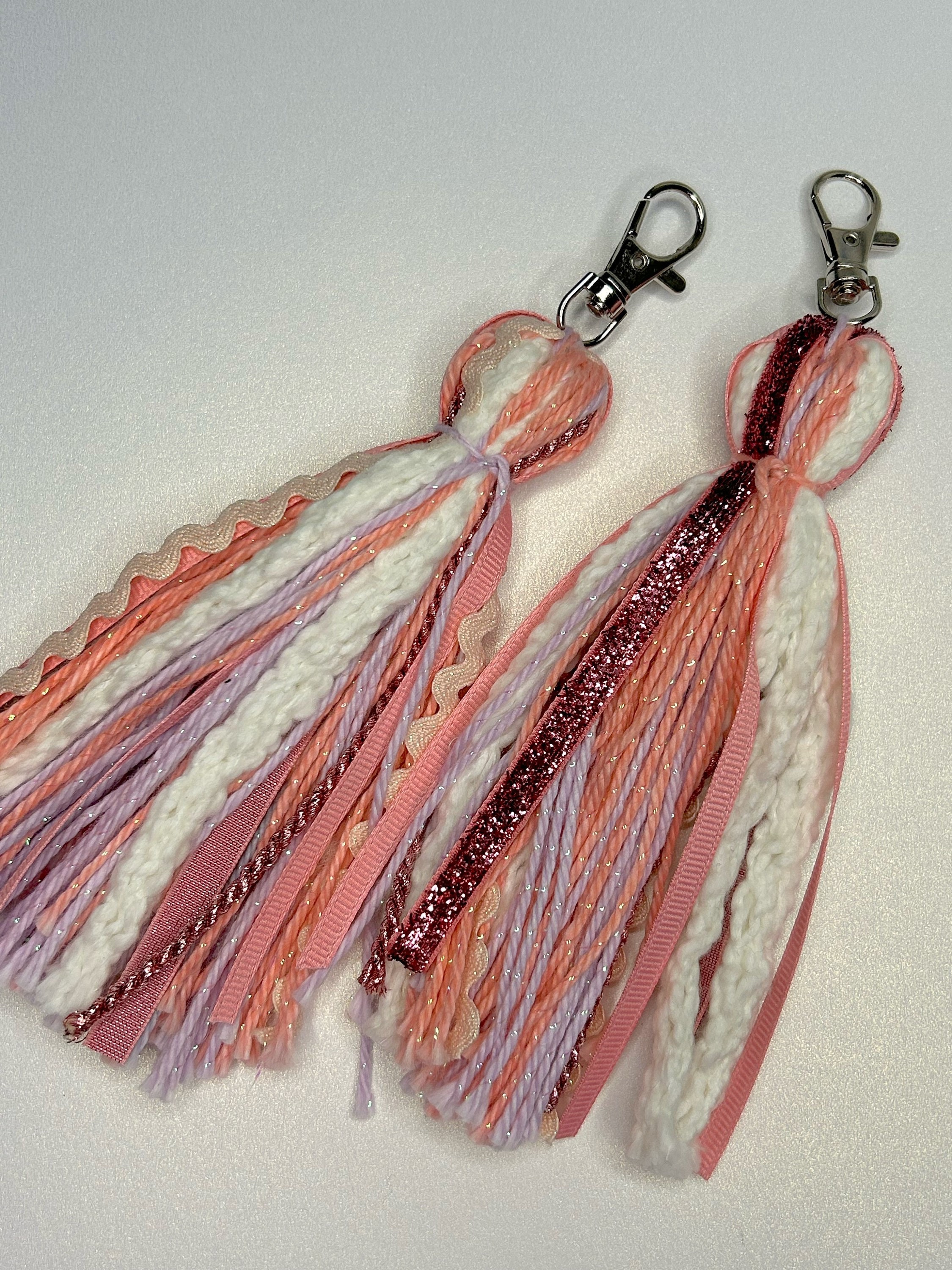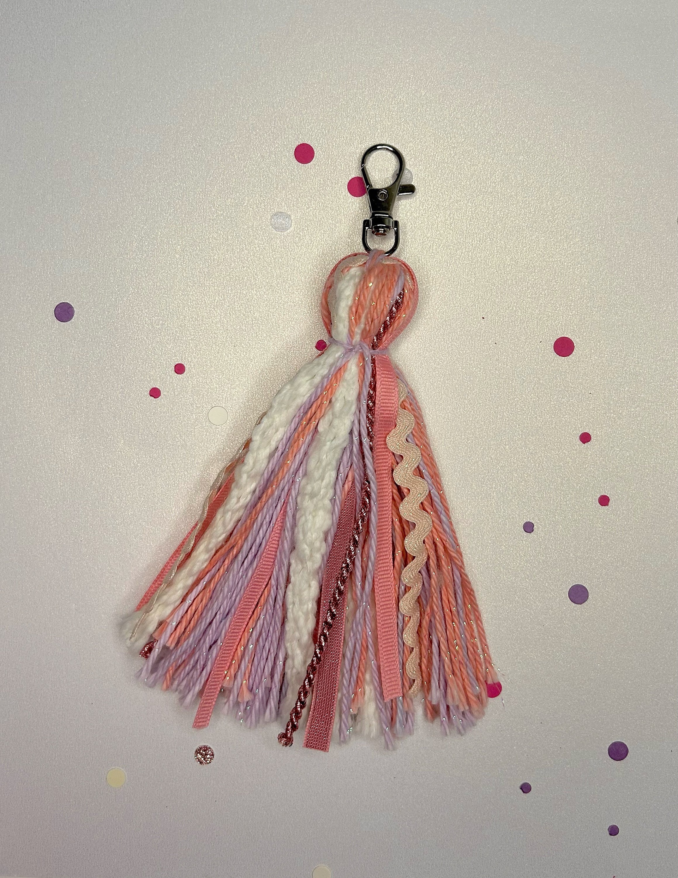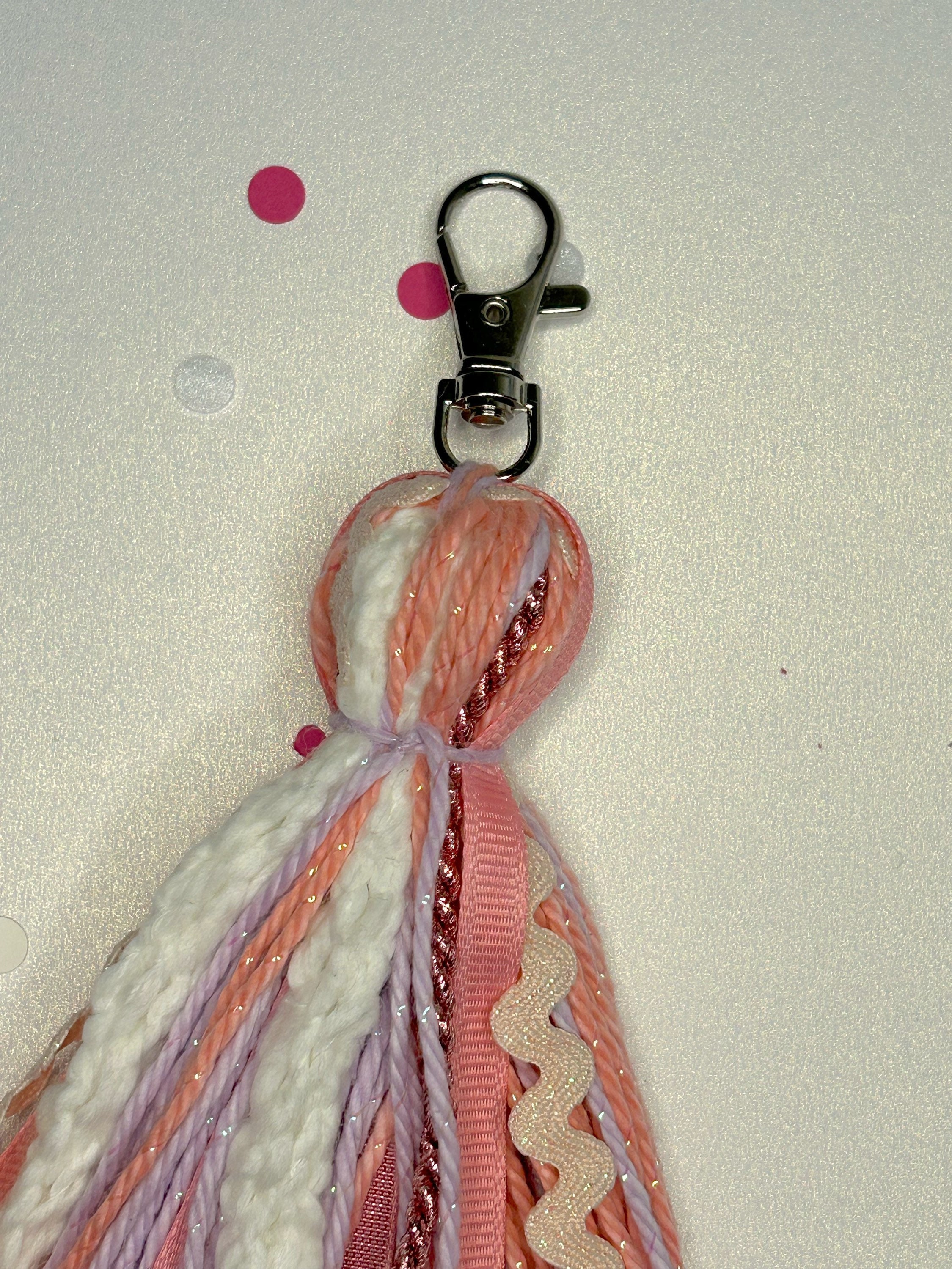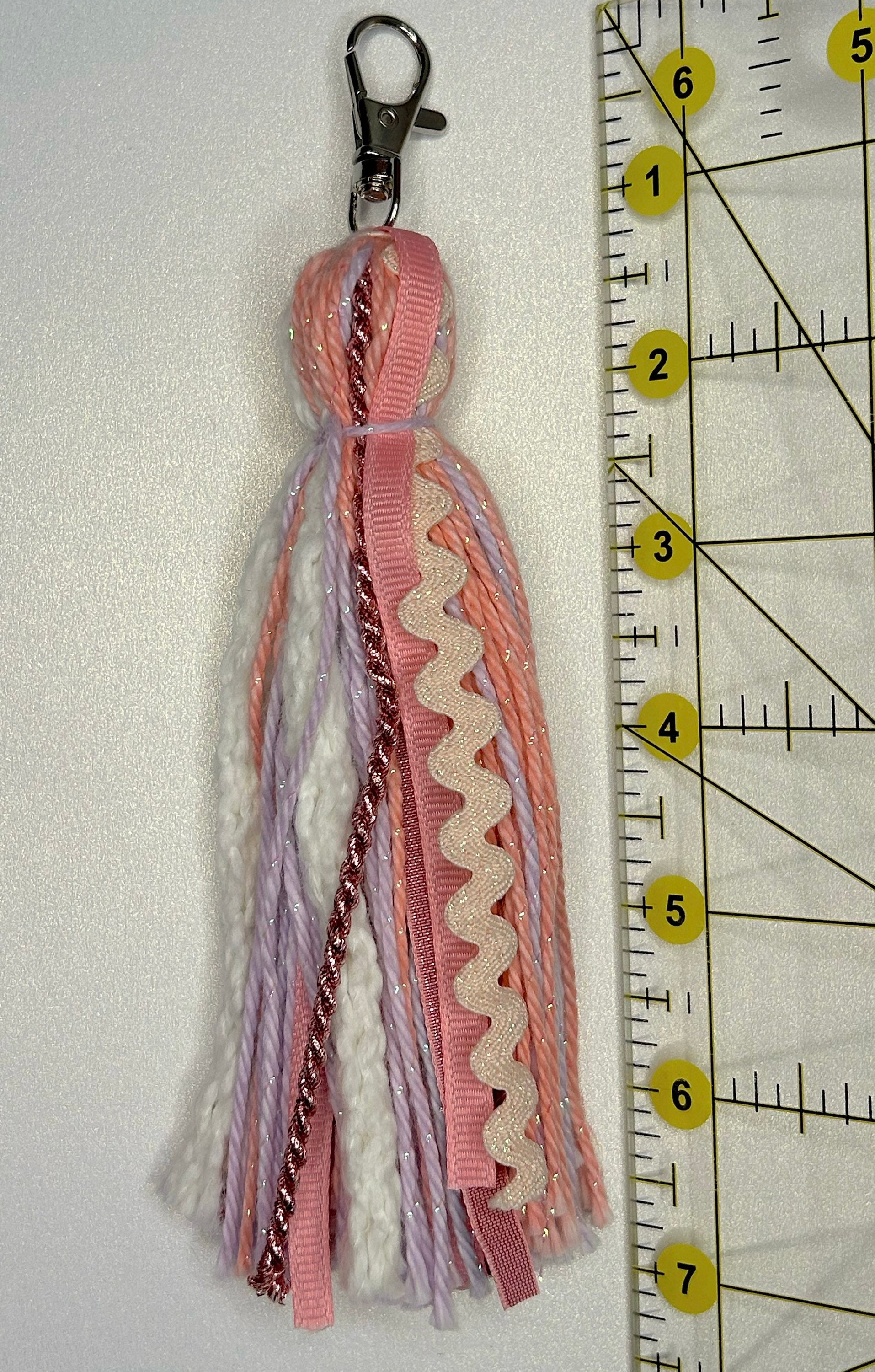 The cutest Enid Sinclair inspired keychain tassel! The tassel is made up of various pink, lavender, and white yarns. The entire keychain and tassel measures to 7” (See picture for reference). This can be clipped on to a key ring, backpack, or even used as a zipper pull.